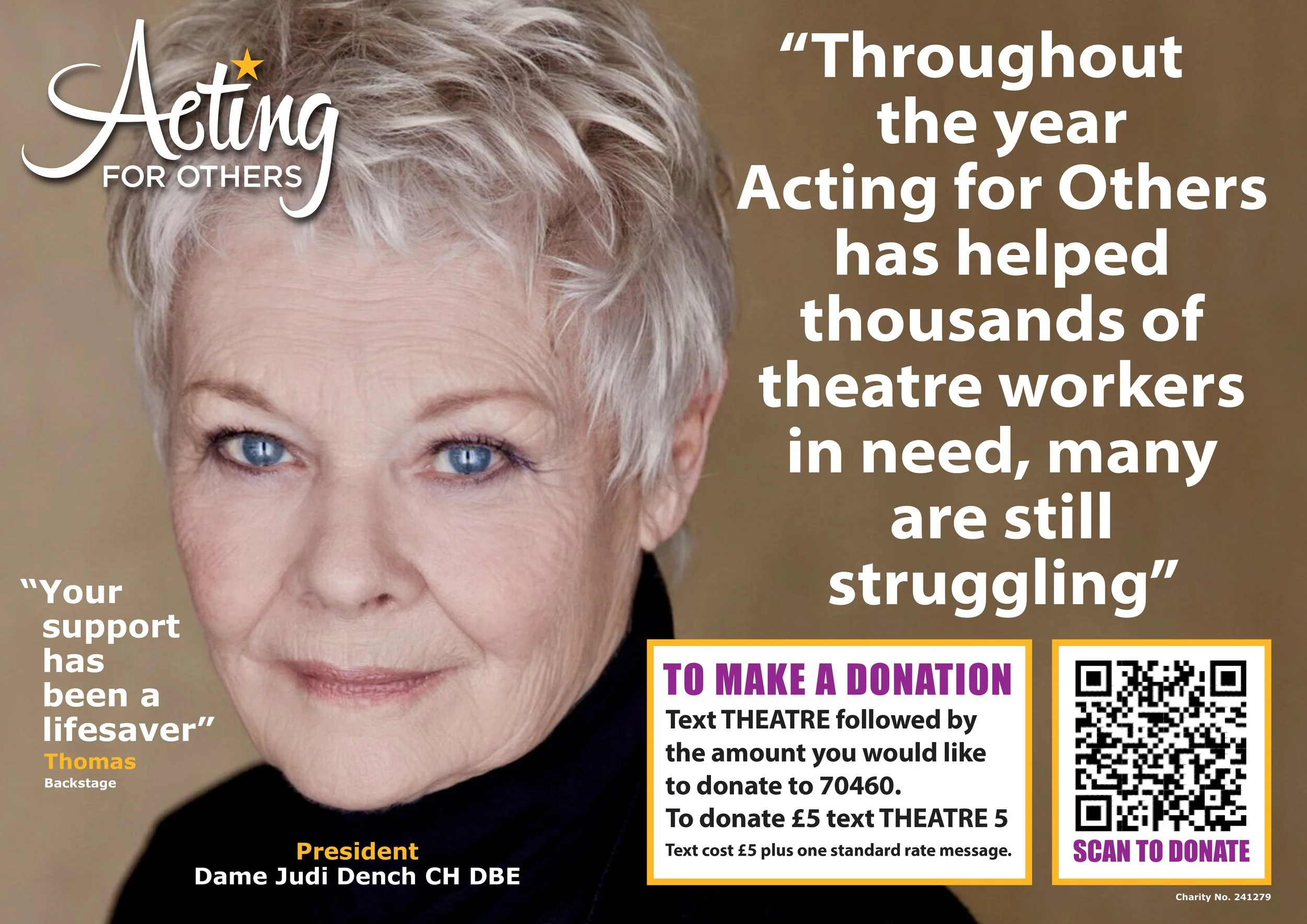 Acting for Others is here every bit an assistance to further the piece of work of the 14 member charities by providing additional funds through our fund-raising activity, donations and legacies to all theatre workers in times of demand, whether they are backstage, on stage or front of firm.